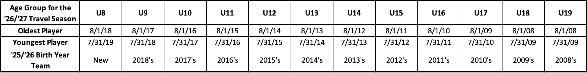In alignment with the US Youth Soccer and NJ Youth Soccer, starting with the 2026-2027 travel season, the age group formation cycle is moving from a player’s birth year to closely align with the player’s school year. Starting with the 2026-27 travel season, age groups will follow an August 1 to July 31 cycle.